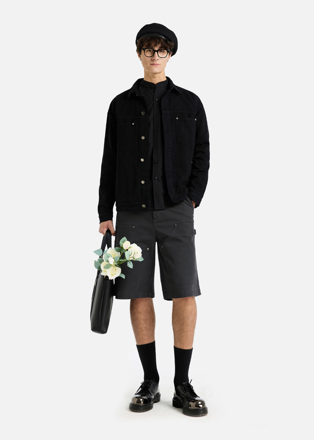 Trên nền vải Jean dày dặn, đứng phom, phom áo được điều chỉnh với vai rộng và dài áo ngắn hơn, tạo nên dáng vẻ workwear cổ điển, cứng cáp và nam tính.