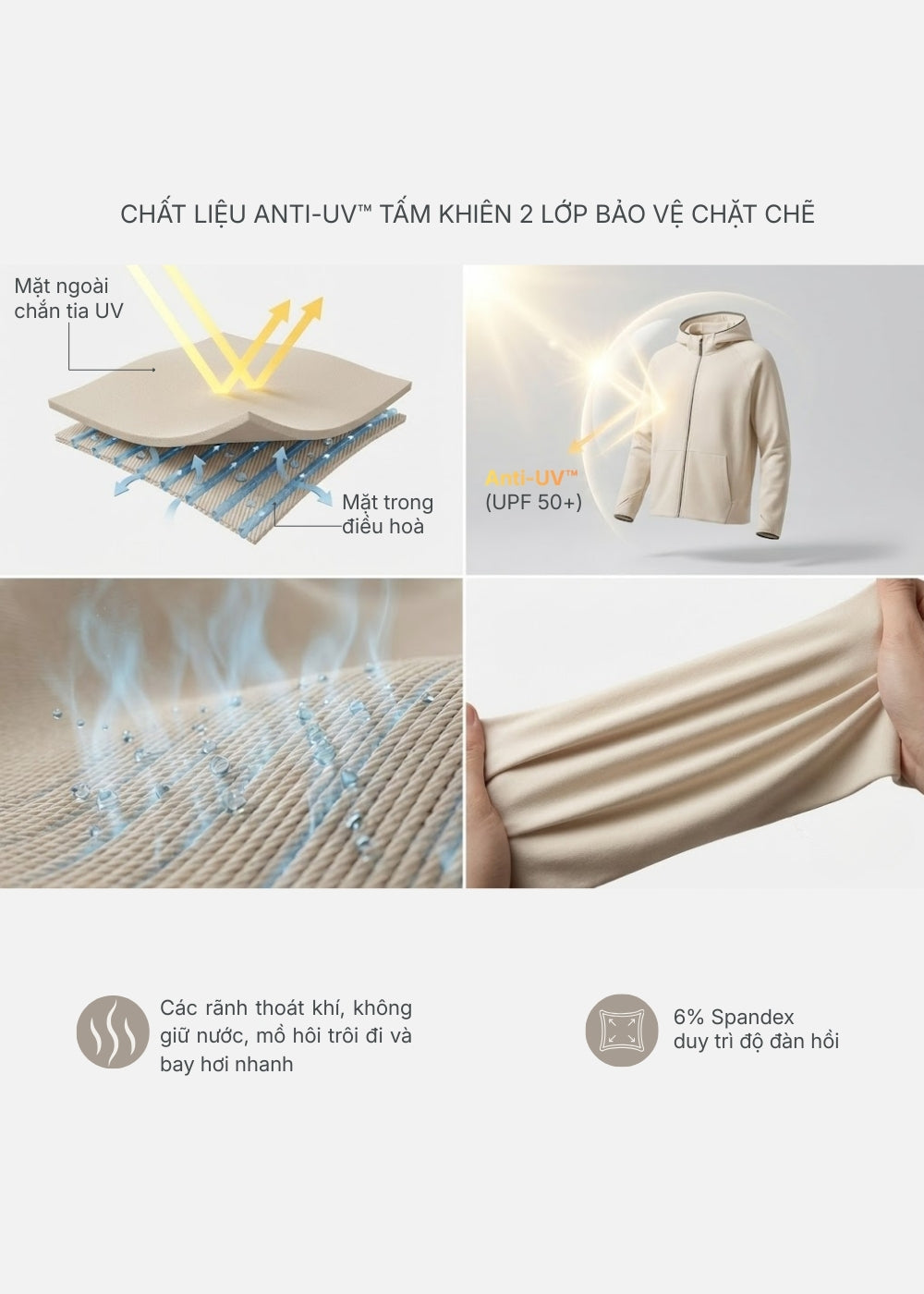 Là do chính kết cấu vải. Độ dày 310gsm và mật độ dệt kín của kỹ thuật Diagonal tạo ra rào cản vật lý tự nhiên. Yên tâm là giặt thoải mái khả năng chống nắng không bị trôi đi như các loại áo khoác dù mỏng phủ lớp Anti-UV rẻ tiền.