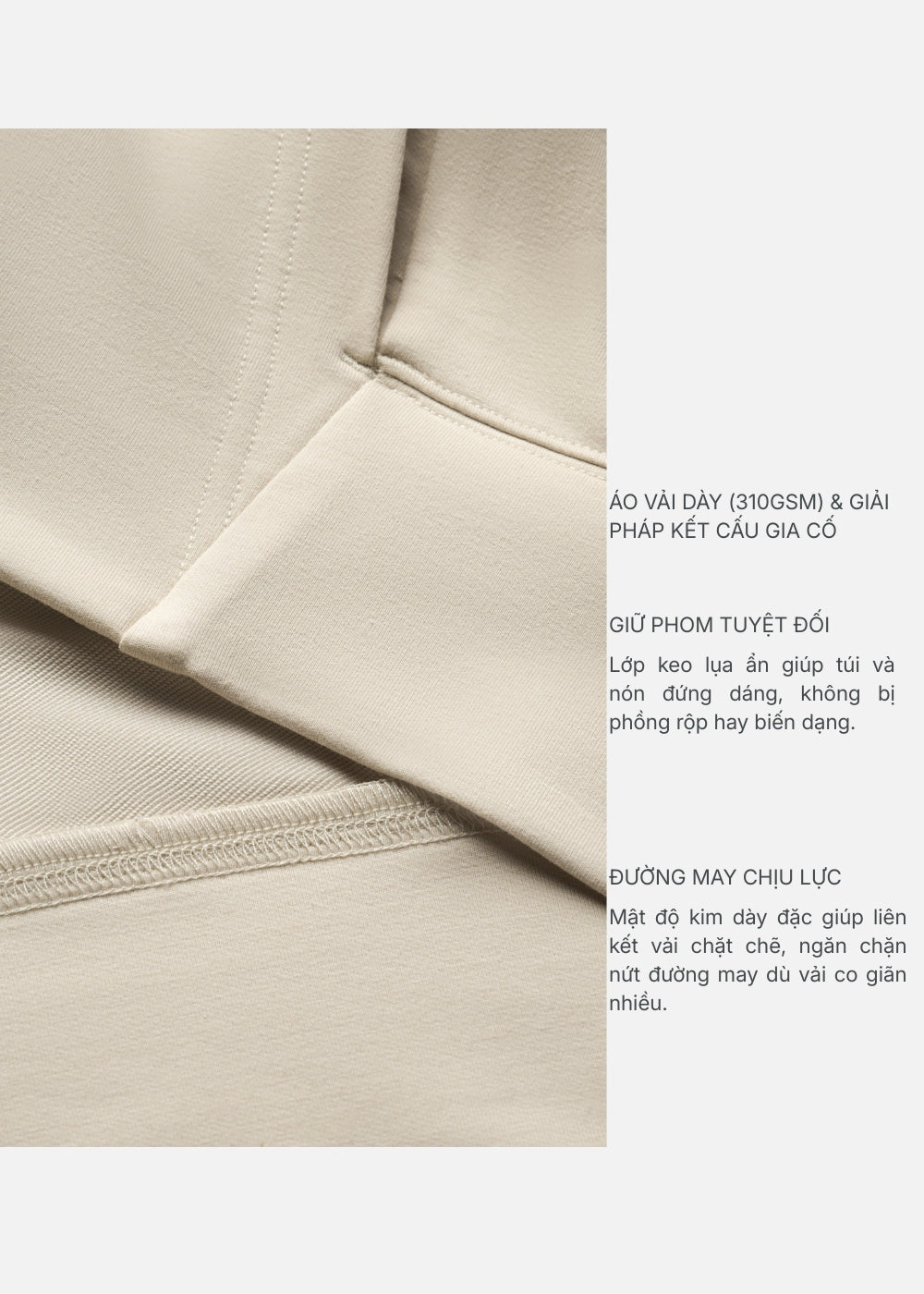 - Chống biến dạng: Sử dụng lớp keo lụa định hình ẩn bên trong nắp túi và vành nón, giúp áo luôn phẳng phiu, không bị dộp hay mất form sau nhiều lần giặt.