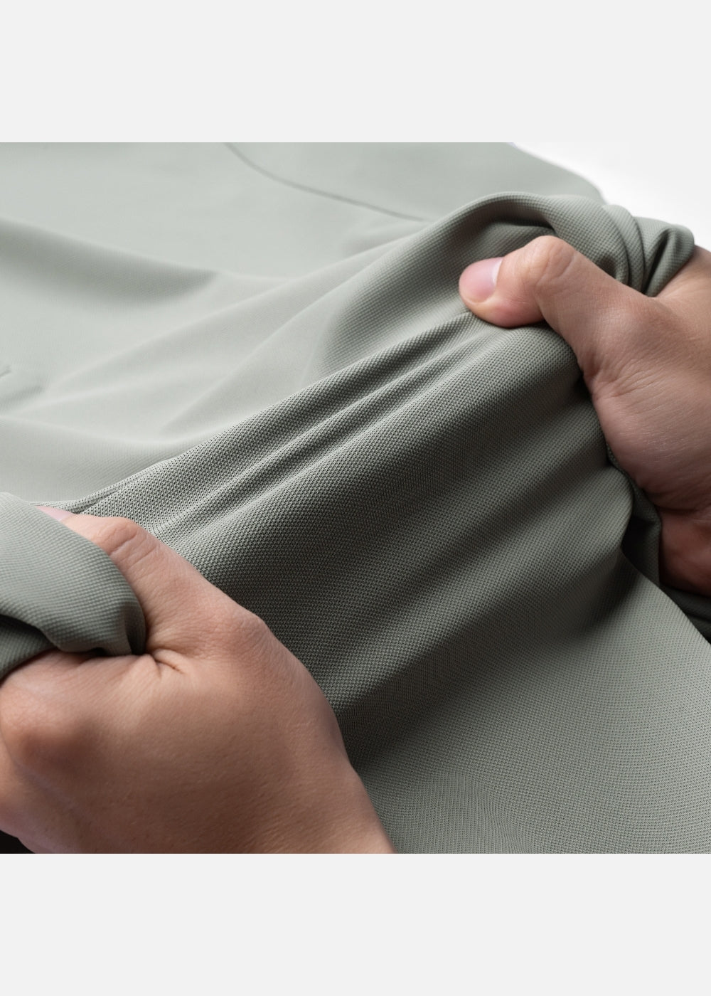 Trên nền vải co giãn 4 chiều, phom áo được tinh chỉnh ôm gọn toàn diện, giúp tôn lên vóc dáng nam tính, khỏe khoắn mà vẫn đảm bảo sự thoải mái.