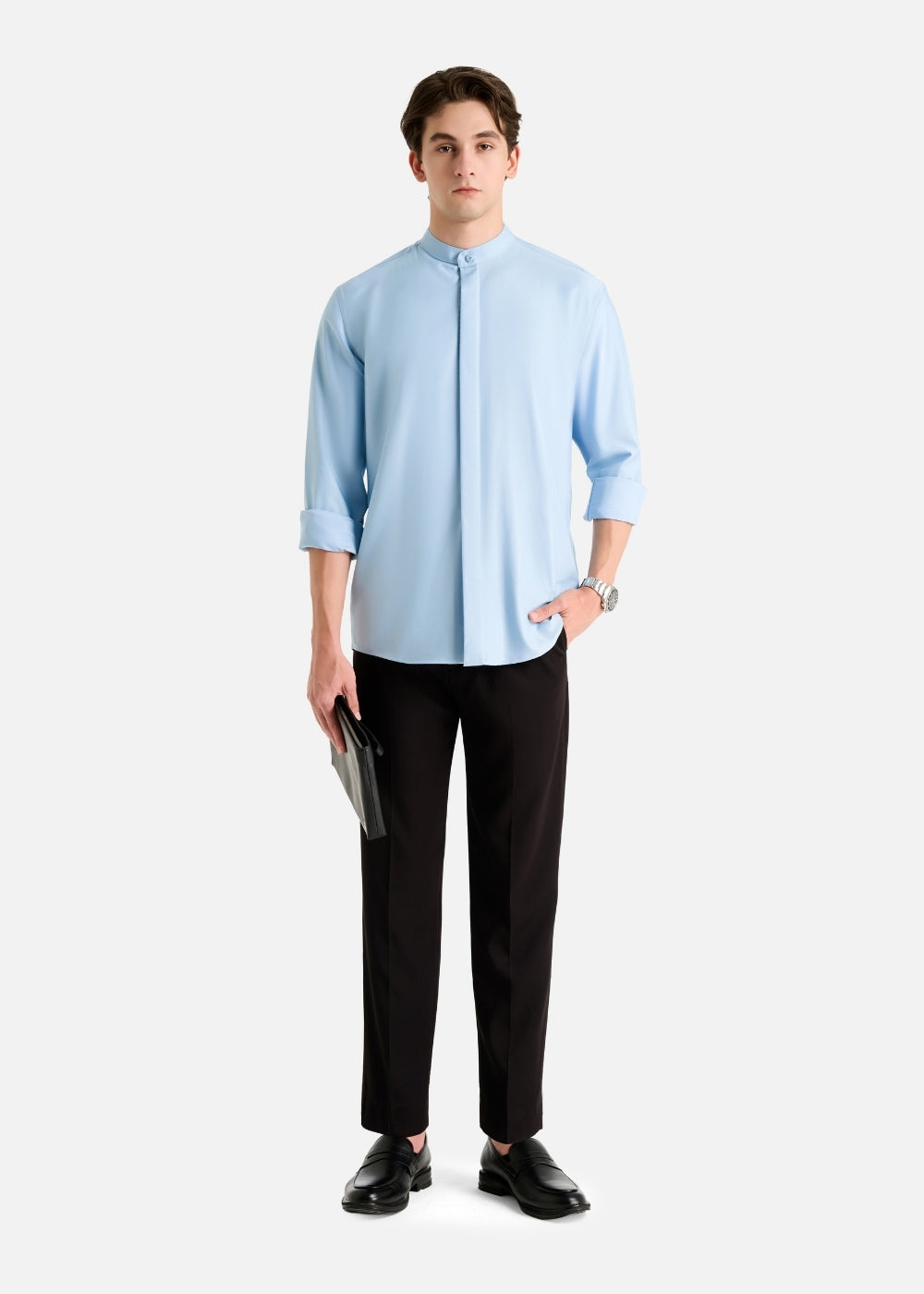 Áo Sơ Mi Cổ Trụ Vải Modal Mềm Mịn Ít Nhăn Non Branded 038 Xanh Dương Nhạt