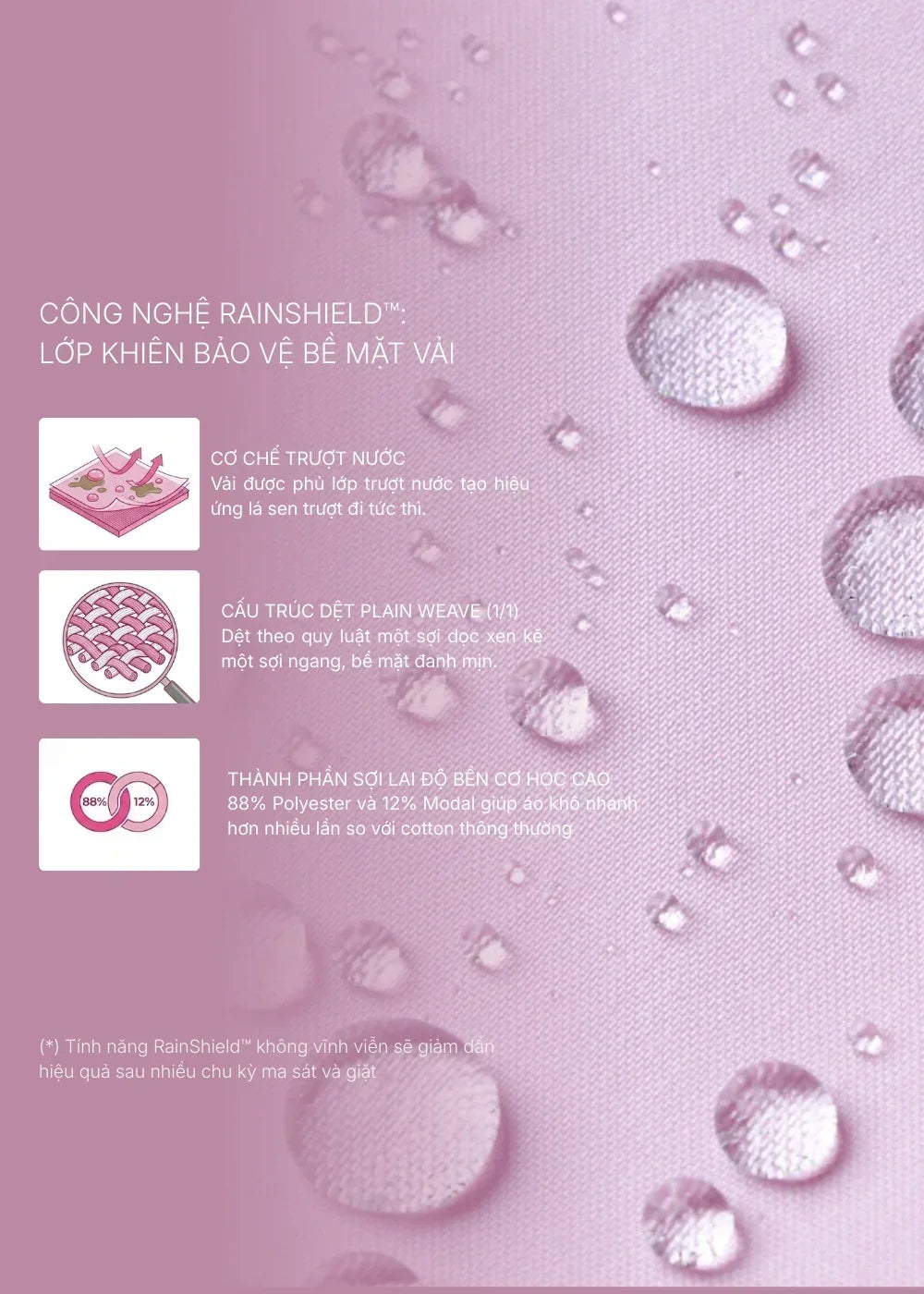 Hoàn toàn không bạn nhé. RainShield™ không phải là dán nilon lên vải mà là công nghệ phủ sợi. Áo vẫn có độ thoáng nhất định nhờ 12% Modal (gỗ sồi), mặc trong văn phòng máy lạnh rất dễ chịu.