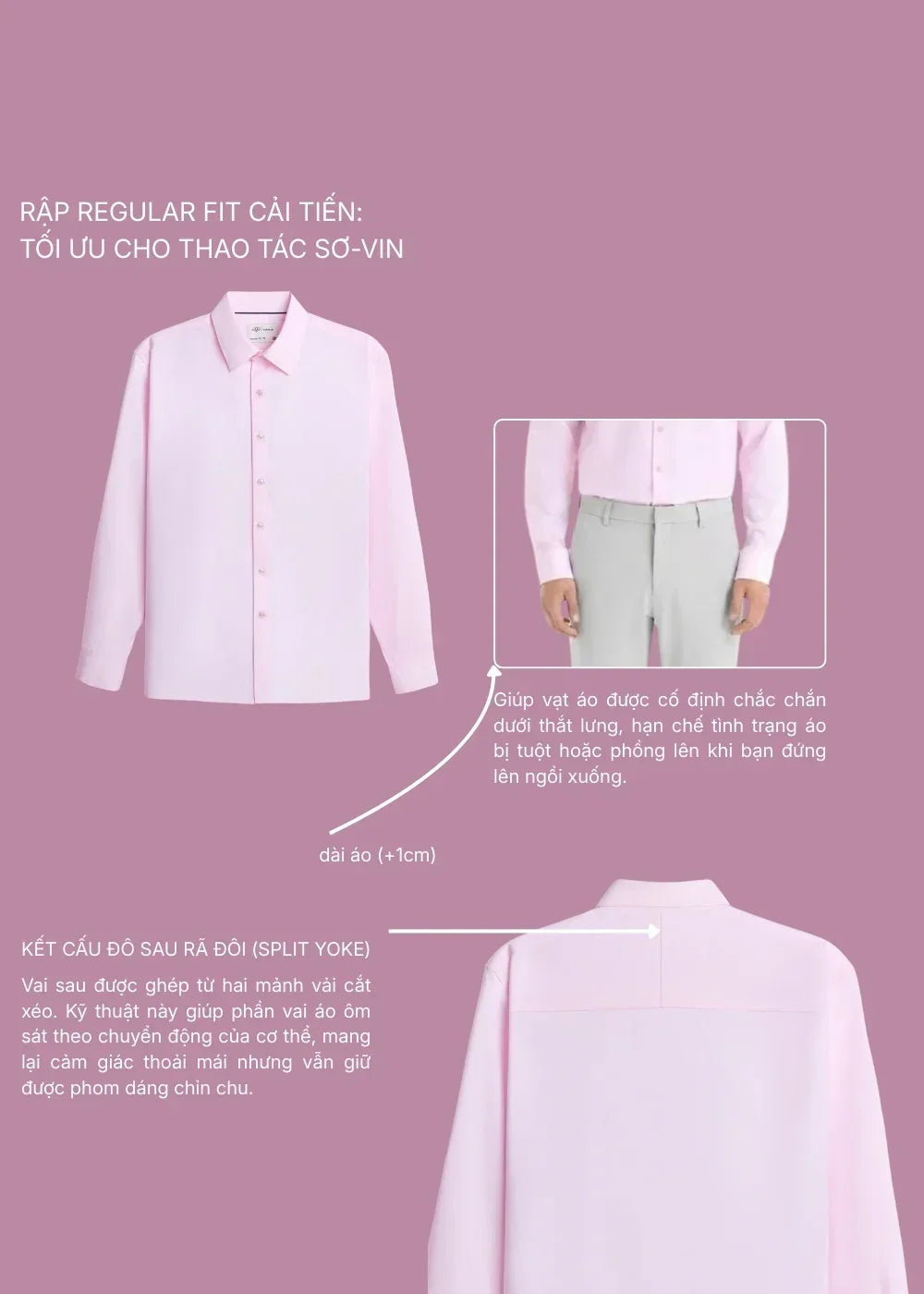 - Tối ưu sơ-vin (đóng thùng): Chiều dài áo được tăng thêm 1cm so với tiêu chuẩn giúp vạt áo không bị tuột khỏi quần khi đứng ngồi hoặc vận động mạnh.