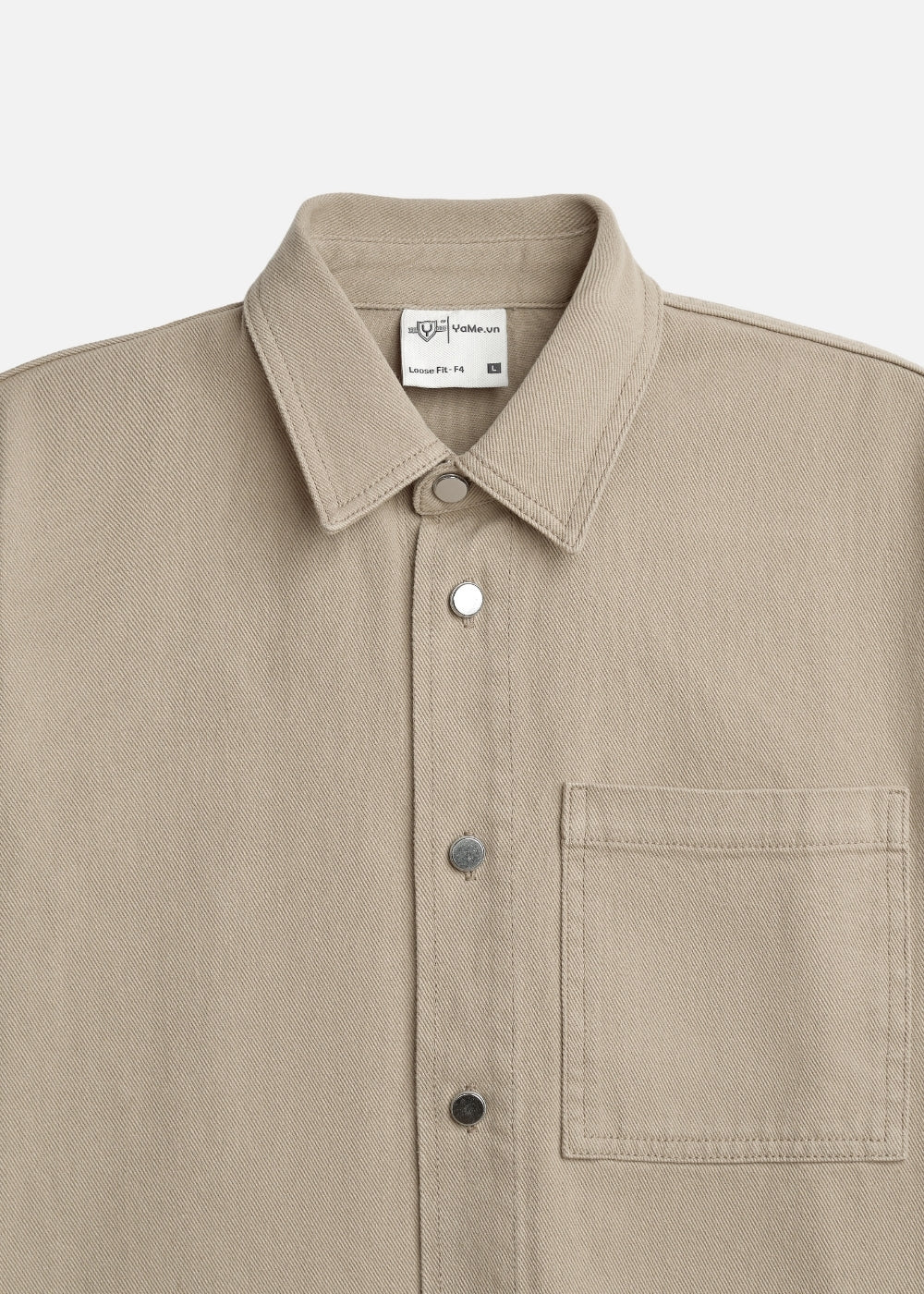 Nó là "con lai" hoàn hảo, hay gọi là Shacket (Shirt Jacket). Nhờ lai áo bản to 4cm và phom hộp, bạn cài nút mặc như sơ mi cũng được, mà khoác ngoài áo thun trắng (layering) thì càng đẹp.