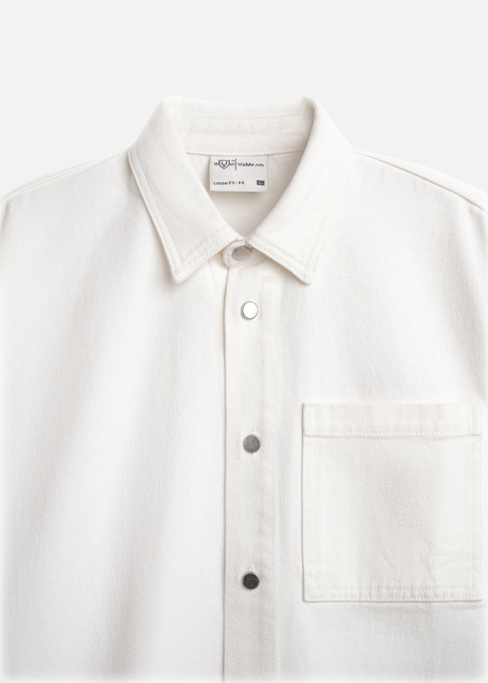 - Chi tiết sản phẩm: Phom Boxy & Loose Fit, Vai trễ (Drop Shoulder), Nút kim loại, Túi ngực áo