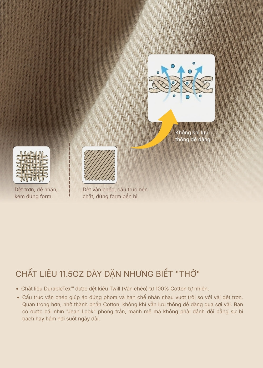 CHẤT LIỆU DurableTex™ 11.5oz: Vải 100% Cotton dệt Twill dày dặn đứng form chuẩn nhưng vẫn thoáng khí không gây bí