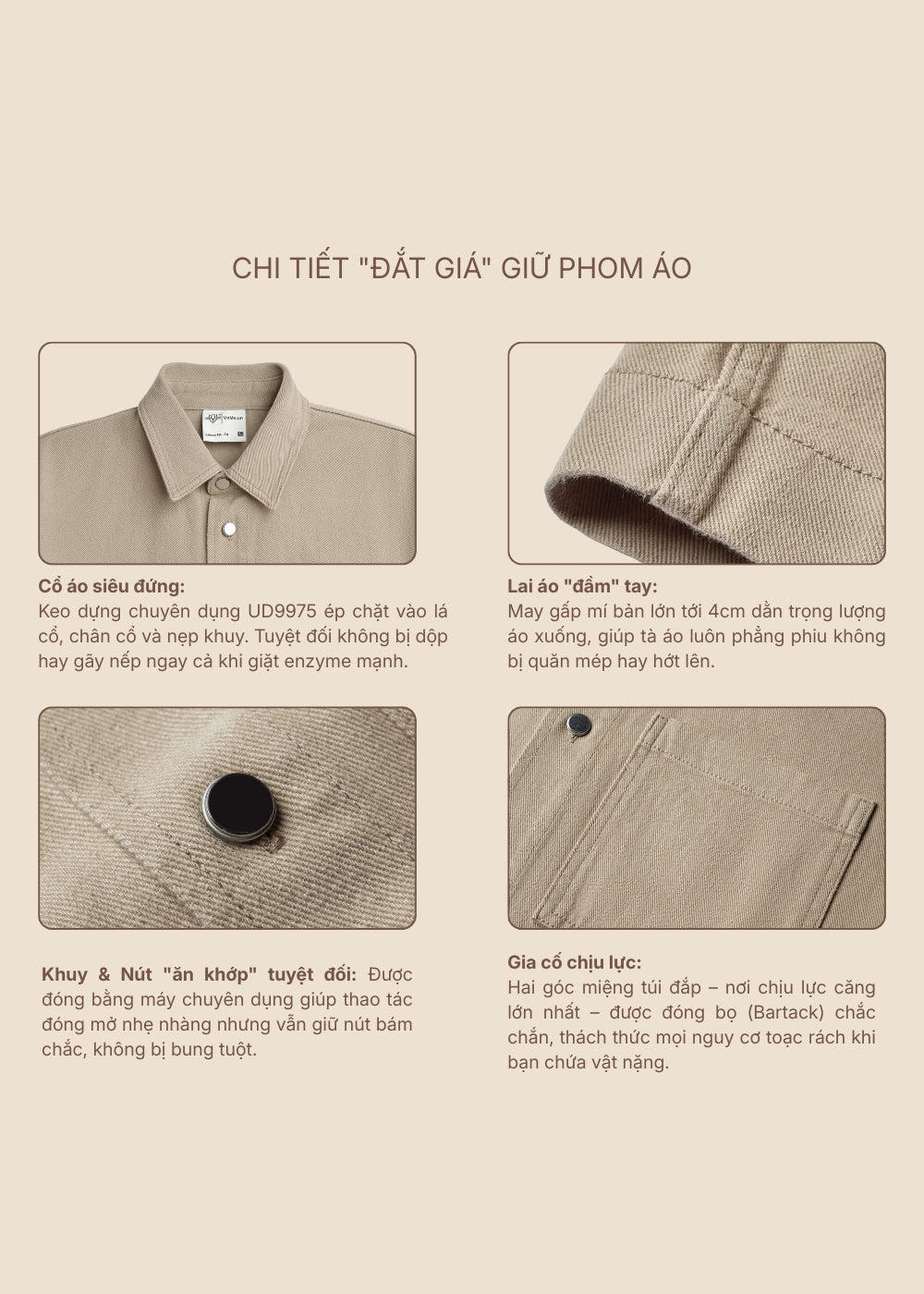 Nó là "con lai" hoàn hảo, hay gọi là Shacket (Shirt Jacket). Nhờ lai áo bản to 4cm và phom hộp, bạn cài nút mặc như sơ mi cũng được, mà khoác ngoài áo thun trắng (layering) thì càng đẹp.