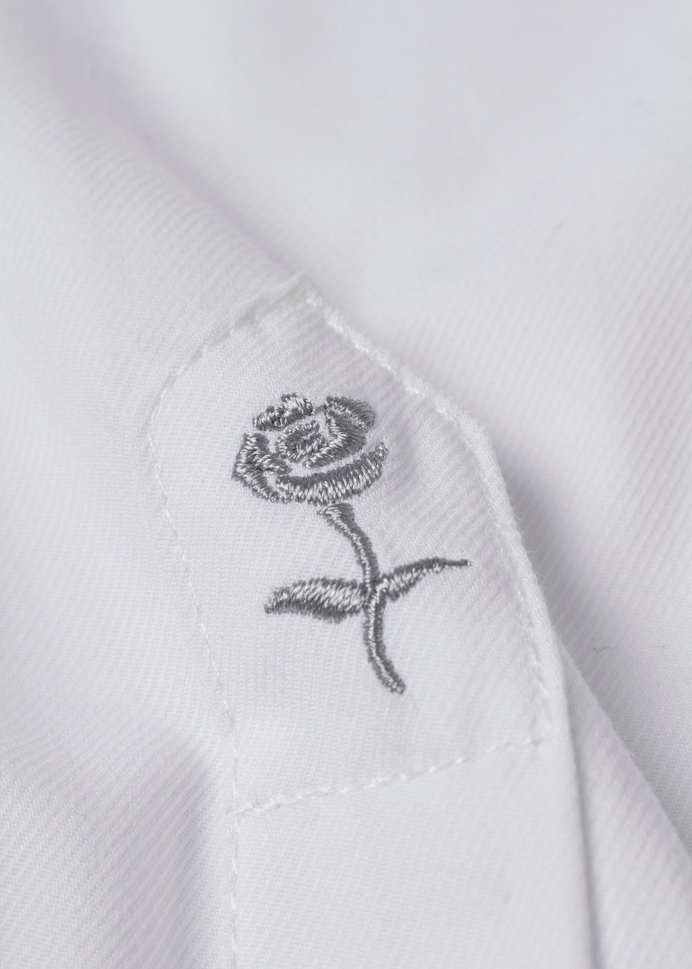 4. Kỹ thuật: Xếp ly đô sau tăng độ thoải mái cho phần lưng khi hoạt động , đột chỉ vị trí viền cổ giúp cổ áo trở nên gọn gàng, chắc chắn. Nút áo kim loại là điểm nhấn độc đáo. Icon hoa hồng được thêu 2D tỉ mỉ như một kí hiệu nhận biết cho loại vải đặc biệt này.