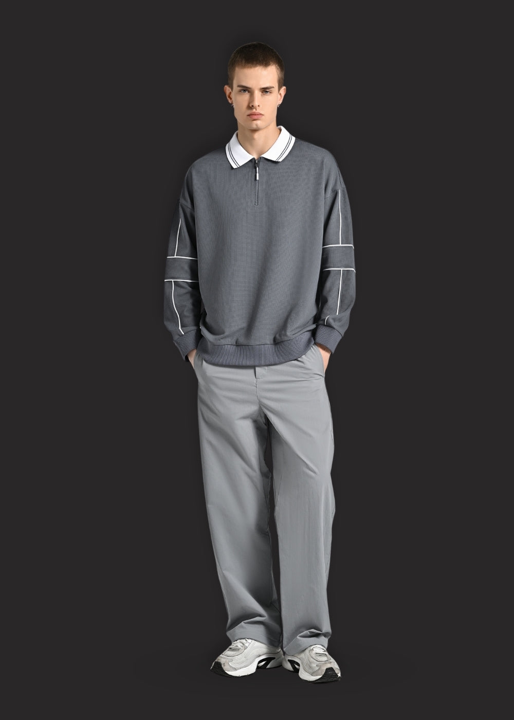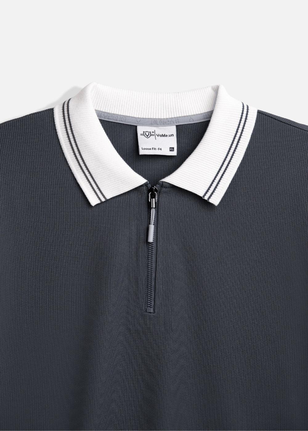 Form rộng và cổ zipper giúp tổng thể trẻ trung, đậm chất retro hơn. Ngoài ra, vải waffle tạo texture lạ mắt và cao cấp hơn so với polo vải trơn.