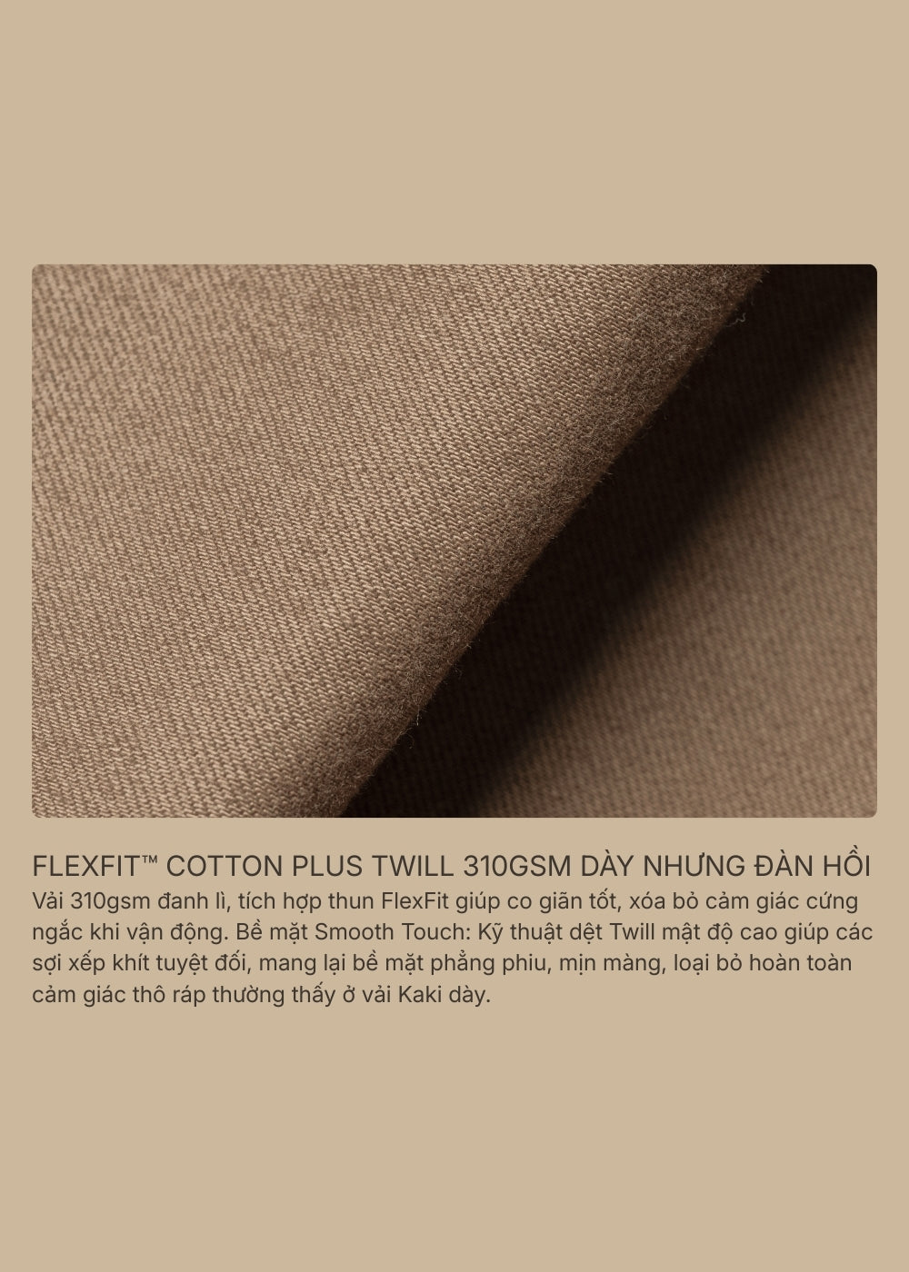 Bề mặt Smooth Touch: Kỹ thuật dệt Twill mật độ cao giúp các sợi xếp khít tuyệt đối, mang lại bề mặt phẳng phiu, mịn màng, loại bỏ hoàn toàn cảm giác thô ráp thường thấy ở vải Kaki dày.