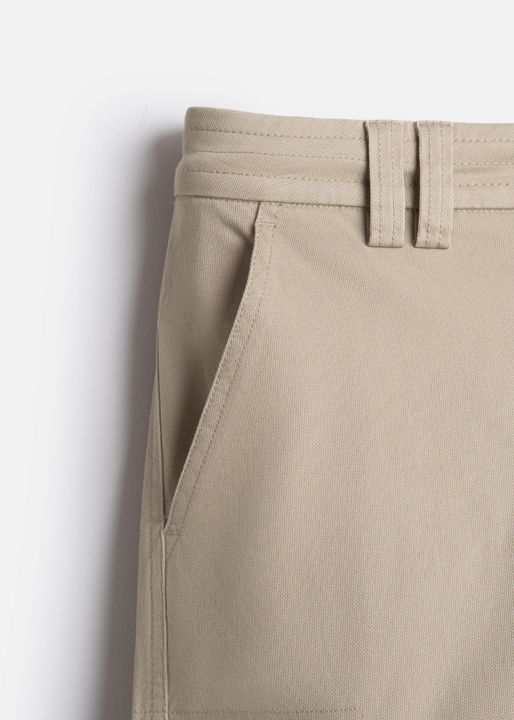 Quần short cargo loose fit, nhiều túi, vải kaki bền bỉ.