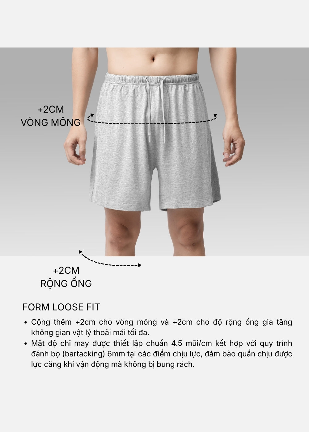 PHOM LOOSE FIT THOÁNG & BỀN: Nới rộng vòng mông và ống giúp thoát nhiệt nhanh. Gia cố bọ 6mm chịu lực tốt khi vận động