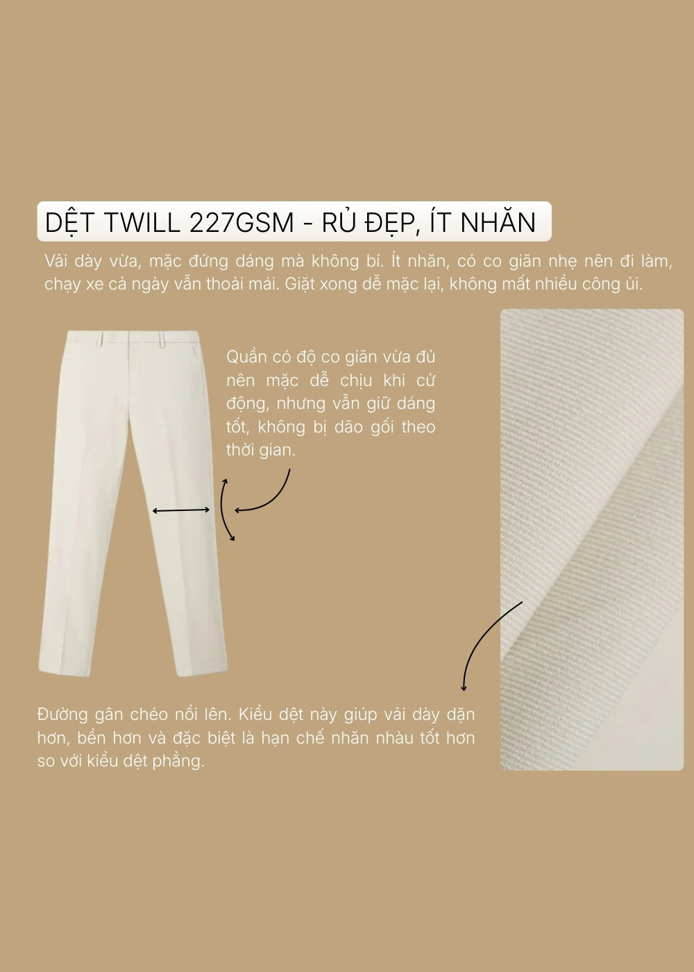 ÍT NHĂN BỀN MÀU: Vải Twill bền màu ít nhăn dễ dàng chăm sóc không tốn nhiều thời gian